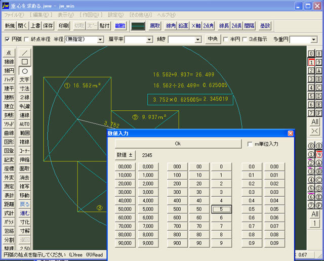 まず①と②の中心を出します。 【/】線(S)を使って、①と②の中心を右クリックして直線を引きます。 そのとき、コントロールバーの【寸法値】にチェックを入れておき寸法を表示させます。 ココでは3,752mmとなっています。 ①+②=26.499㎡となりますので、①と②の面積比は ①÷(①+②)=0.625005となります。(①の面積は①+②の62.50%) この結果から、①の中心からの面積案分で中心を決定します。 3,752mm×0.625005=2,345mmとなります。 ![]() 次に【円弧(C)】を使って3,752mmの線上に2,345mmの位置を決めます。 この場合は、①の面積が大きいですから中心は①の方に近寄るはずです。 ステータスバーの円弧にチェックしておきます。 ②の中心でマウス右クリックします。 ステータスバーの【半径】の▼を右クリックして【数位入力】の窓を開きます。 2,345mmと入力してOKをクリック。 適当なところを左クリック、左クリックします。 ![]() ①と②を結ぶ直線と、先ほど書いた円弧の交わる位置が①と②の中心となります。 長さを測ってみると2,345mmで間違いないようです。