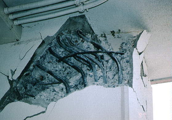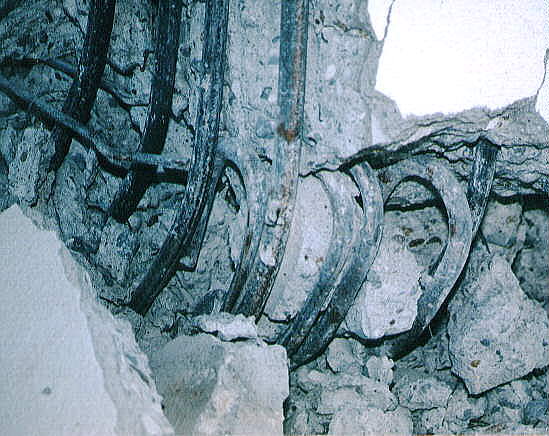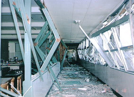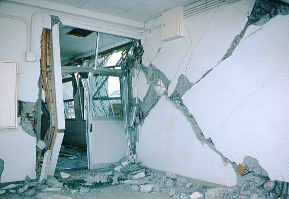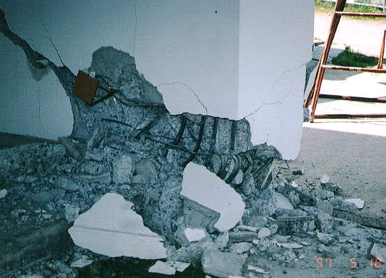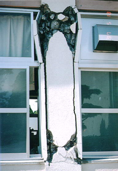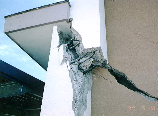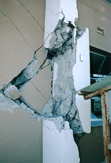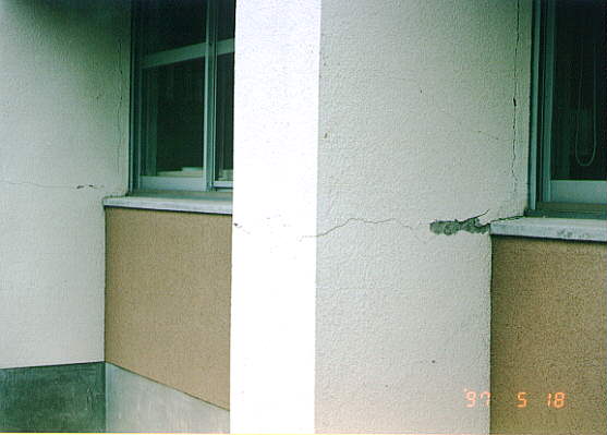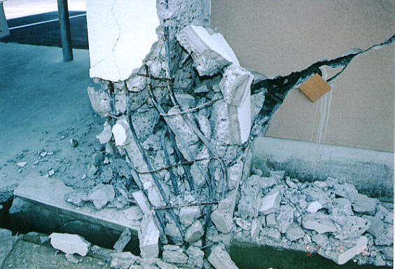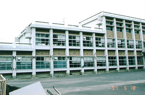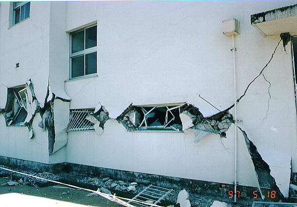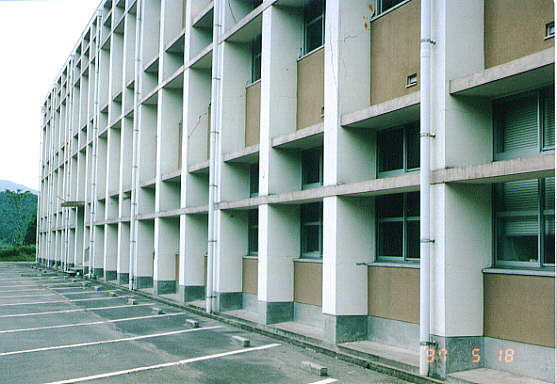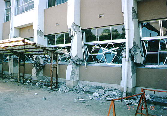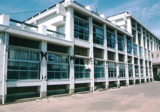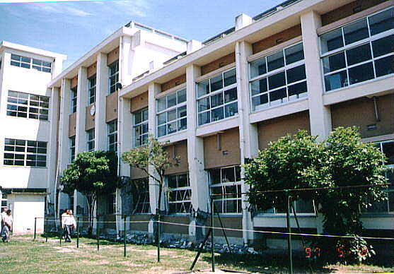 て部分が階段状に連なった北棟と、総3階建ての2 つの建物を渡り廊下でつないだ建物です。 2棟の建物とそれらより新しい体育館があります。 被害の状況は、北側の棟が古く1階部分は壊滅状態 南側の棟は北側より新しく1階の柱にクラックはあ るが、被害は少なかった。 体育館は、ほぼ無傷の状態です。 北棟、南棟共妻側の被害は小さかった。 建設当時の構造設計基準の欠陥が被害の違いを表し ている現場です。 写真データーの為重たくなっていますが、取りあえ ず一部を掲載します。御了承下さい。 |